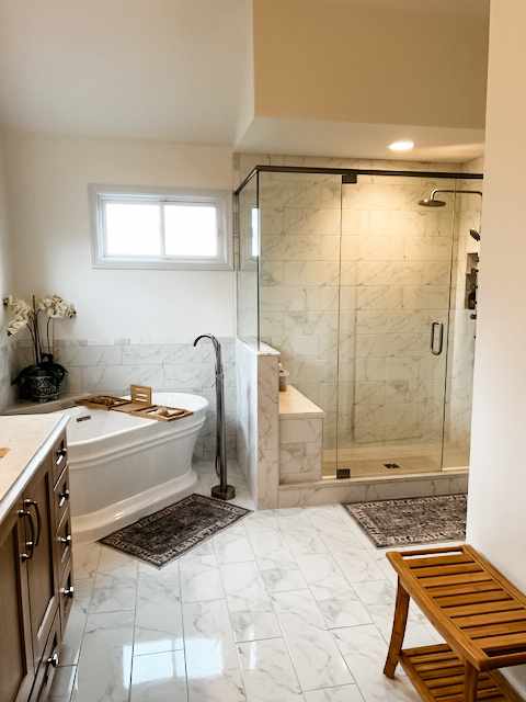 This once-dated primary bathroom has been transformed into a serene, spa-like oasis, featuring marble-inspired tile, a sleek glass-enclosed shower, and a freestanding soaking tub. Warm wood cabinetry, soft lighting, and brushed metal fixtures create a perfect balance of luxury and comfort, turning the space into a calm retreat within the home.